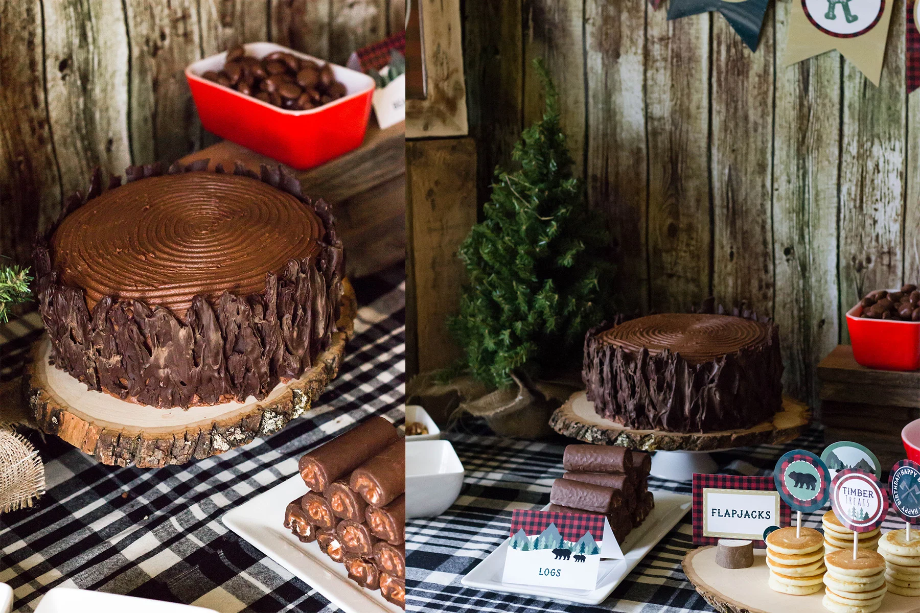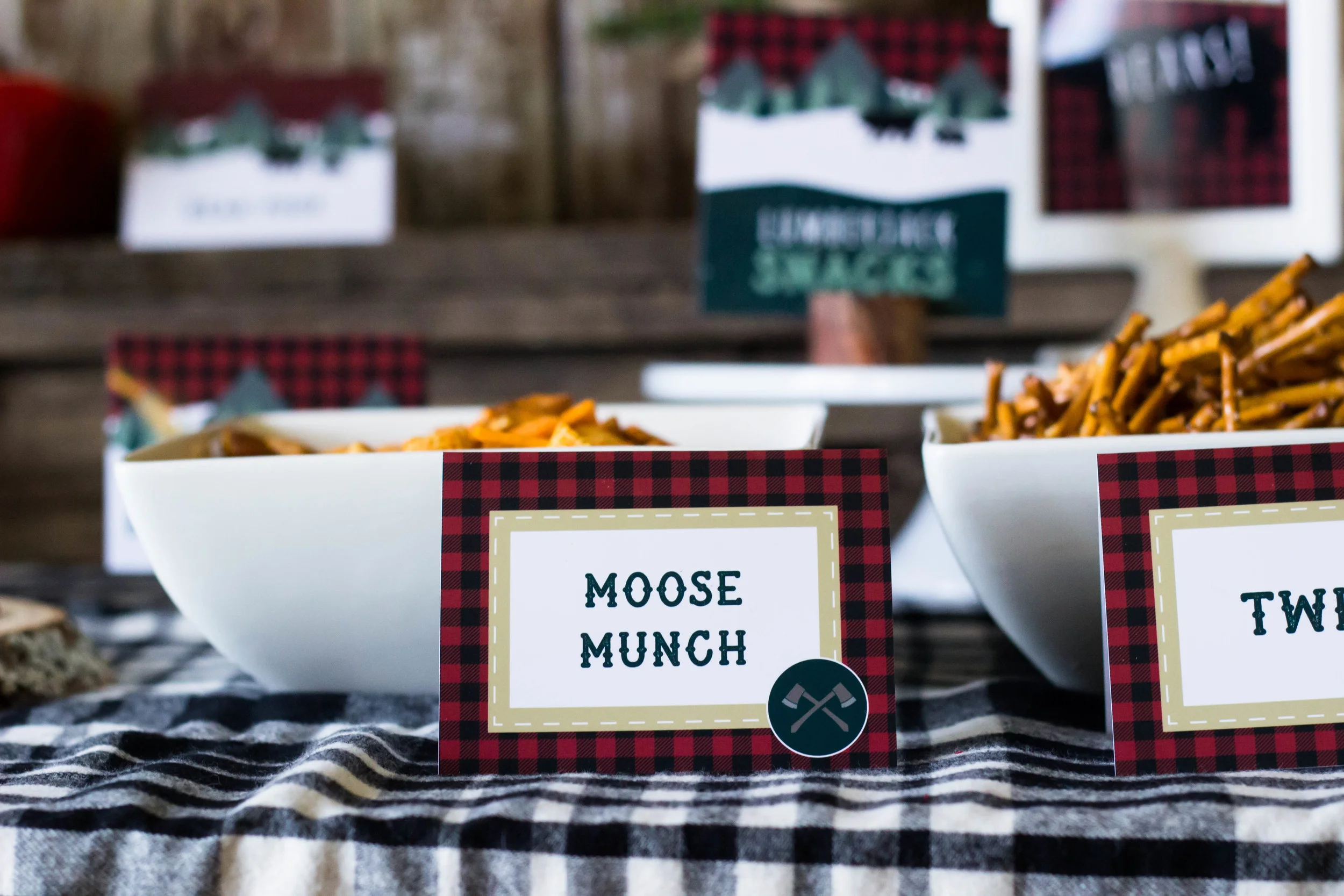 Naming party food is always fun for me. I loved coming up with the food for this one. Guests ate moose munch (chex mix), twigs (pretzel sticks), logs (swiss rolls), and bear poop (milk duds). Grab these printable cards here.