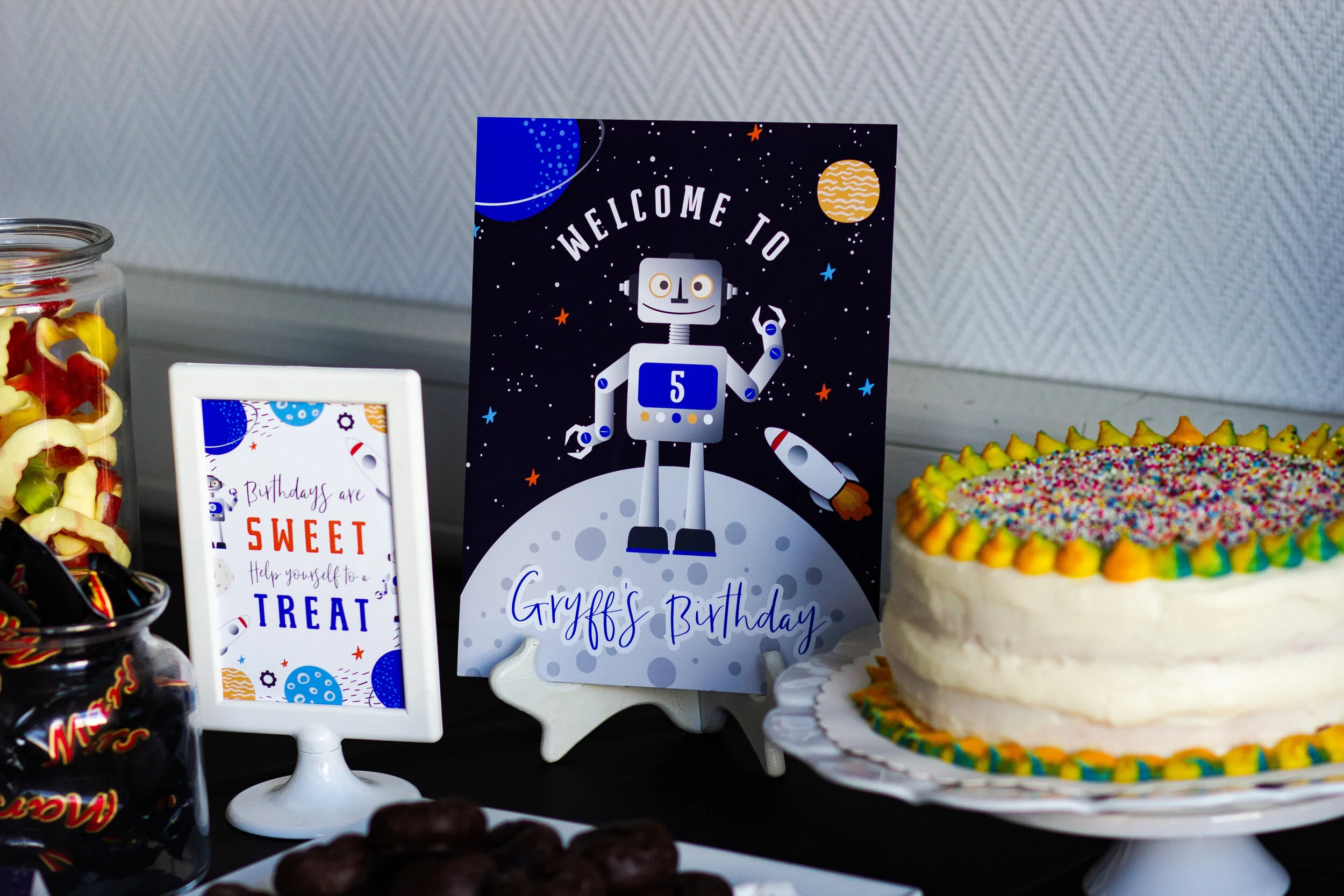 Blast off to a super cool Robot themed birthday party. This party was designed to coordinate with the supplies from Meri Meri party.